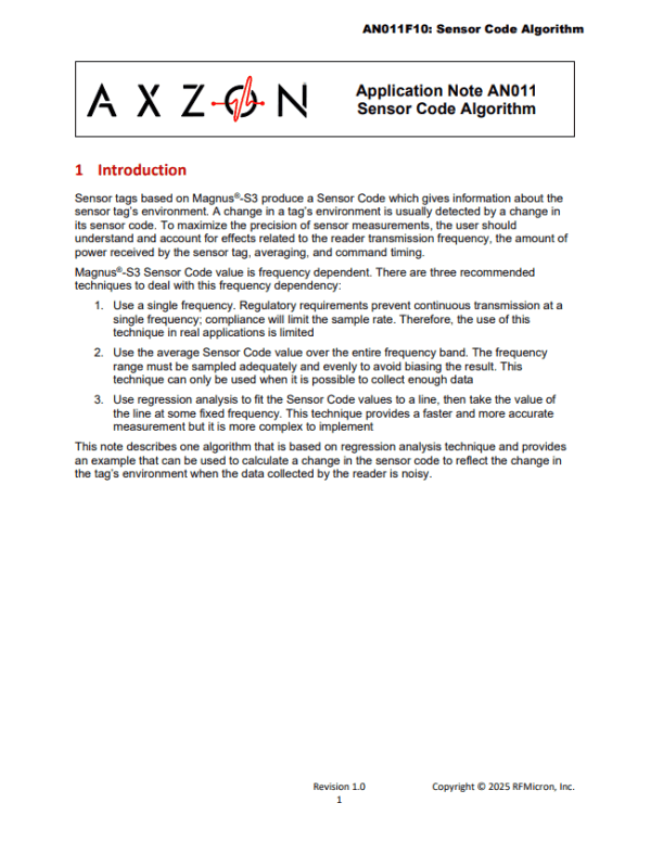 AN006: Sensor tags based on Magnus®-S produce a Sensor Code which gives information about the sensor tag’s environment. In addition, Magnus®-S3 chips can generate a Temperature Code indicating the chip temperature. To maximize the precision of sensor and temperature measurements, the user should understand and account for effects related to the reader transmission frequency, the amount of power received by the sensor tag, averaging, and command timing. This note describes best practices for maximizing the accuracy of measurements with Magnus®-S.